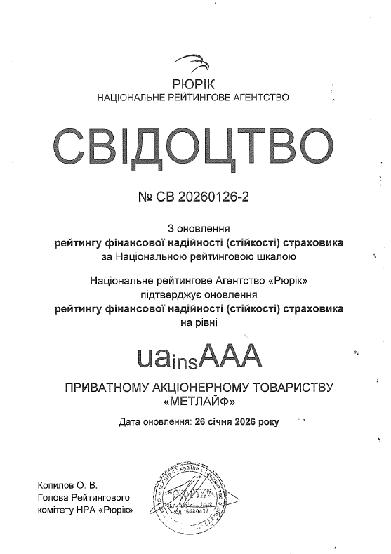 Рейтинг фінансової надійності страховика:2026_sertificate_uaAAA.pdf (metlife.ua)